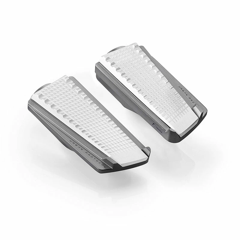 The Urban Protocol pegs embody the Rizoma know-how essence in aluminium high-precision machining. The innovative design consists of a double anodizing and a particular fade finishing technique. The base is wider to improve ergonomics and to include a central plate, which is non-slip, replaceble and characterized by a contrasting finishing with toothed pins to highlight the grip area.