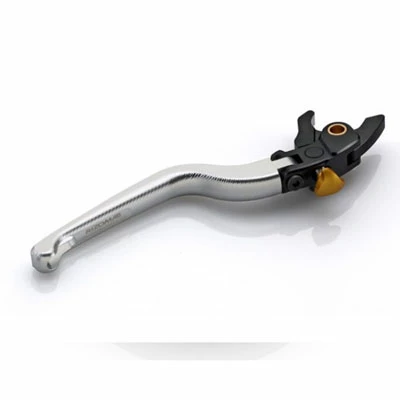 Never again under pressure Braking is one of key events in driving, on the track as it is on the road, an event that puts the driver under pressure and requires constant perfection in concentration, practice, vision and controls. Drivers in βheroicβ times usually put adhesive tape on the brake lever, so that they always had the very best hand grip when dethrottling. Today, necessity and technology have changed but the front brake lever is still of fundamental importance, especially with the use of modern radial calipers, with additional aesthetic requirements. This is why Rizoma has created its new, patented design, brake lever, which is above all aerodynamic. Extensive wind tunnel studies have shown that at speeds above 180 km per hour, the force of the air causes movement of the lever, which puts the hydraulic circuit under pressure, limiting the bikeβs performance. Rizoma has therefore strived to reduce this detrimental effect to the minimum. Aesthetics and practicality are naturally of the highest order, in accordance with Rizoma traditions; the lever is shaped from the solid and anodized in three colors, (black, gold and natural billet). The design of the system is the result of very thorough research, which led the company to decide to patent it. From the practical point of view, there are ultra fine lines on the front to give the driverβs hand the right degree of grip and an articulated joint to avoid breakage in the event of a slide. The technology used in the construction is of the highest order; the lever offers a wide range of adjustment and moves on bearings with return springs specifically for operational precision, reliability and durability. Price is only for brake lever. Brake lever fits only stock brake master cylinder. Picture describes a generic brake lever (could not be your bike lever) and a clutch lever (could not be your bike lever and has to be ordered apart)