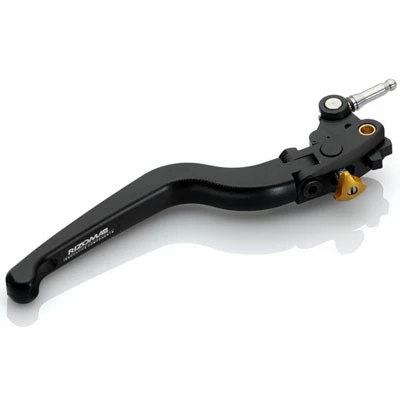 Never again under pressure Braking is one of key events in driving, on the track as it is on the road, an event that puts the driver under pressure and requires constant perfection in concentration, practice, vision and controls. Drivers in “heroic” times usually put adhesive tape on the brake lever, so that they always had the very best hand grip when dethrottling. Today, necessity and technology have changed but the front brake lever is still of fundamental importance, especially with the use of modern radial calipers, with additional aesthetic requirements. This is why Rizoma has created its new, patented design, brake lever, which is above all aerodynamic. Extensive wind tunnel studies have shown that at speeds above 180 km per hour, the force of the air causes movement of the lever, which puts the hydraulic circuit under pressure, limiting the bike’s performance. Rizoma has therefore strived to reduce this detrimental effect to the minimum. Aesthetics and practicality are naturally of the highest order, in accordance with Rizoma traditions; the lever is shaped from the solid and anodized in three colors, (black, gold and natural billet). The design of the system is the result of very thorough research, which led the company to decide to patent it. From the practical point of view, there are ultra fine lines on the front to give the driver’s hand the right degree of grip and an articulated joint to avoid breakage in the event of a slide. The technology used in the construction is of the highest order; the lever offers a wide range of adjustment and moves on bearings with return springs specifically for operational precision, reliability and durability. Price is only for brake lever. Brake lever fits only stock brake master cylinder. Picture describes a generic brake lever (could not be your bike lever) and a clutch lever (could not be your bike lever and has to be ordered apart)