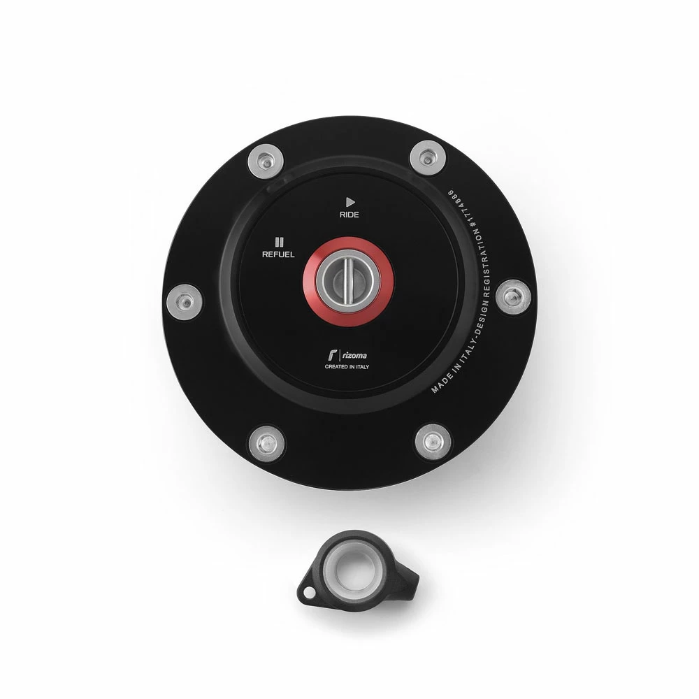 The Rizoma fuel tank cap in made entirely from billet aluminum and combines design, technology, high quality materials and safety. The Key Lock System reduces the risk of tampering while maintaining ease of installation and use. The two-tone finish is obtained through anodization, which keeps it looking good for longer.